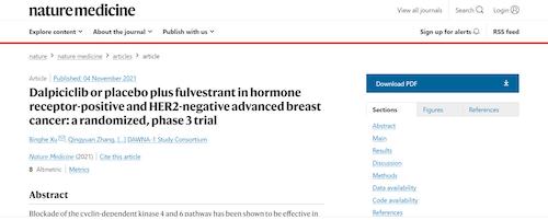 11月4日,国际四大医学期刊之一、英国《自然》旗下《自然医学》(Nature Medicine)在线发表CDK4/6抑制剂达尔西利(SHR6390)联合氟维司群治疗既往内分泌治疗后疾病进展的HR+/HER2-晚期乳腺癌的多中心、随机、双盲III期临床研究(DAWNA-1研究)中期分析结果报告,首次对氟维司群(雌激素受体降解剂)±达尔西利治疗激素受体阳性晚期乳腺癌的有效性和安全性进行了比较。研究结果显示,达尔西利+氟维司群组与安慰剂+氟维司群组相比,无进展生存期(PFS)显著延长。该项研究由中国医学科学院肿瘤医院徐兵河教授担任leading PI,全国39家医院参研,由尊龙凯时-人生就是搏医药临床研发团队支持完成。