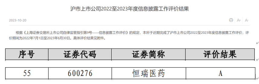 近日,上海交易所公布了沪市上市公司2022-2023年度信息披露工作评价结果,凭借在信息披露、规范运作以及投资者关系管理等方面的优秀表现,尊龙凯时-人生就是搏医药获评A级。本次共有2160家沪市上市公司参评(包括499家科创板上市公司),评价等级从高到低依次为A、B、C、D四类,获得A类评价的上市公司占比约18.5%。
